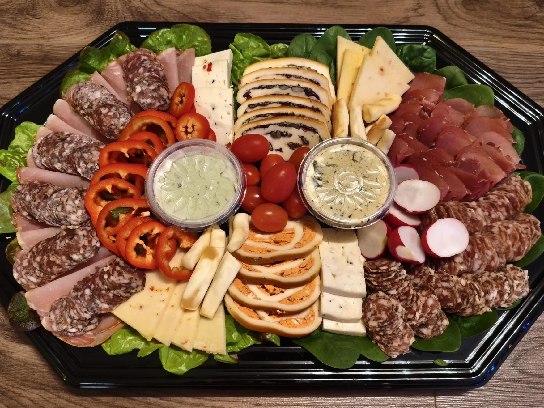 A vidéki ínyenc tálunk 6 fő részére (12-15dkg/fő) elegendő finomságokat tartalmaznak.